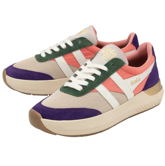 Elevating the humble trainer to be a statement footwear choice is Gola Raven. Served up with contrasting colour pairing, there’s no disputing that high octane fashion is back! Mesh with coral pink, royal purple and evergreen are contrasted with wheat and an off white sole to a powerful effect in this striking women’s trainer.