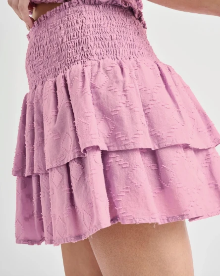 Our Olivia Jacquard Mini Skirt is the picture-perfect option for your next event or date night. This 100% cotton ultra mini skirt features a beautiful all-over jacquard print and smocked elastic detailing for a comfortable fit. Plus, we love the two tier skirt design.This is a great item to wear with our Pointelle LYR Short for added coverage. Pair with our Olivia Jacquard Tank to create a matching set.