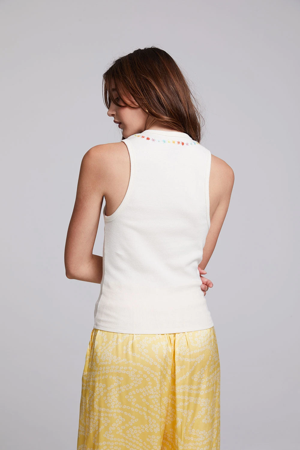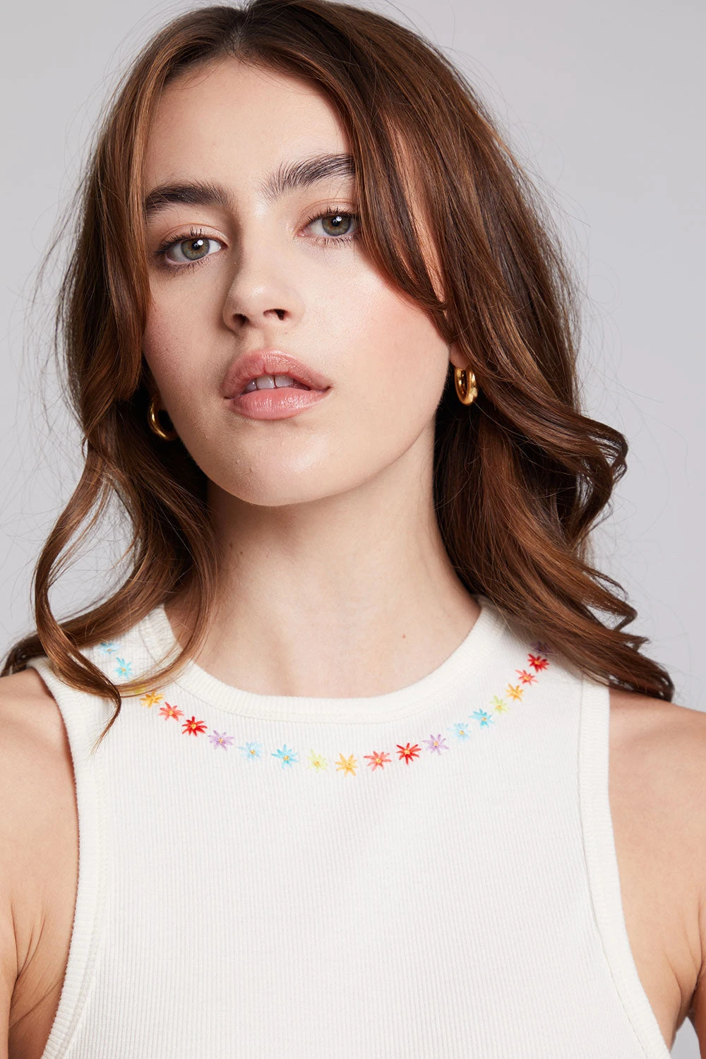 Our recycled vintage rib Carnaby top features neckline embroidery and slight stretch.