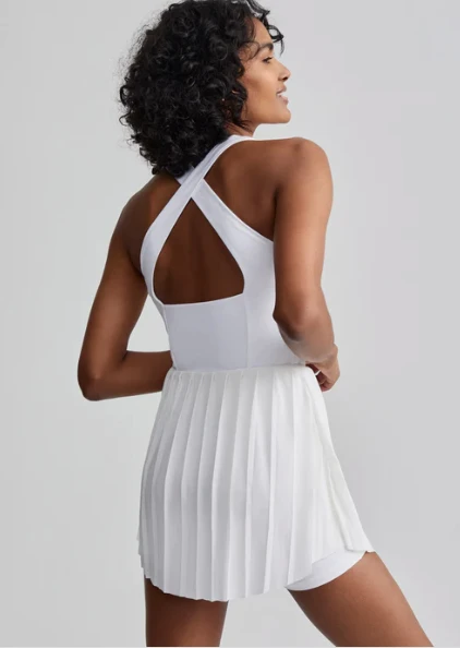 Crafted from a breathable and lightweight fabric, this active dress features a short, pleated skirt over a sculpted pair of shorts. The form-fitting body comes complete with a square neckline and crossover straps at the back for added support.